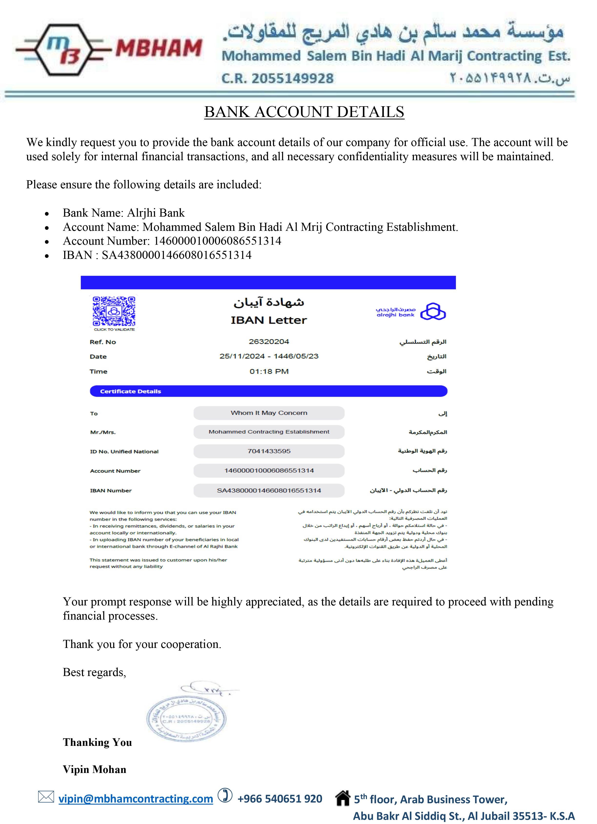 MBHAM Contracting Company 5th Floor, Arab Business Tower, Jubail, KSA